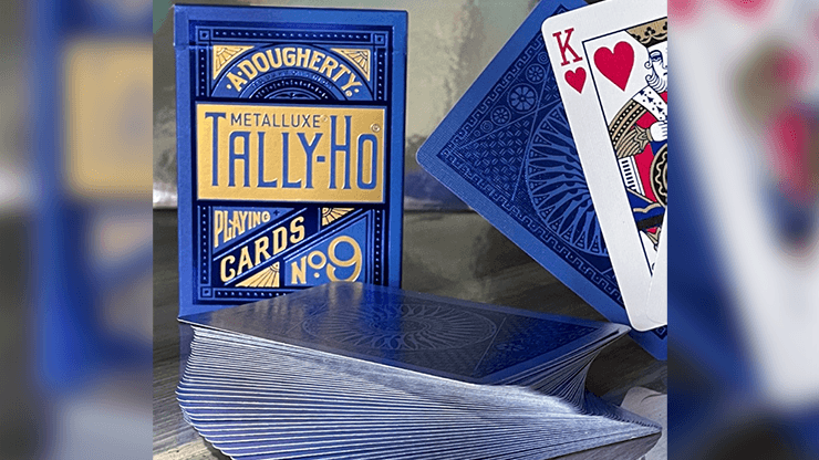 Les cartes à jouer Tally-Ho MetalLuxe® sont le nec plus ultra des jeux de cartes à collectionner de luxe. Les cartes à jouer Tally-Ho MetalLuxe présentent le magnifique design classique du dos de la carte en forme de cercle Tally-Ho dans une feuille métallique de collection. L’étui et le dos de la carte sont tous deux estampillés d’une véritable feuille de métal pour obtenir une brillance éblouissante. L’étui présente une magnifique feuille bleue royale qui attire le regard ainsi qu’une feuille d’or étincelante, tandis que le dos des cartes est estampillé d’une feuille bleue étonnante pour créer le motif classique du dos circulaire Tally-Ho.
