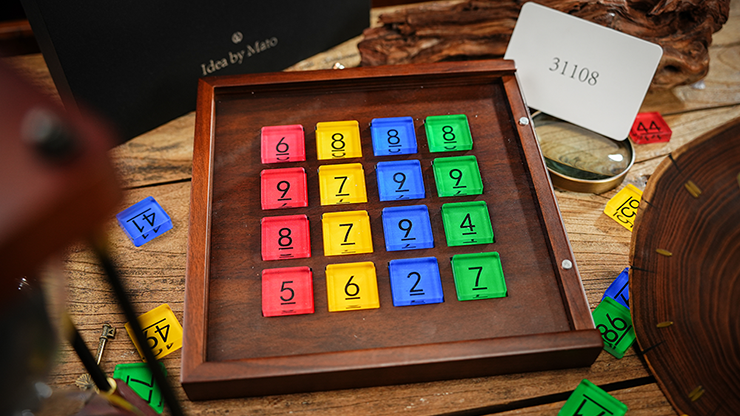 Le plateau en bois haut de gamme est doté d’un couvercle en acrylique à fermeture magnétique. Une fois les tuiles placées à l’intérieur, le couvercle se met en place avec un clic, permettant au magicien d’incliner ou de faire pivoter librement le plateau sans qu’aucune tuile ne bouge.
