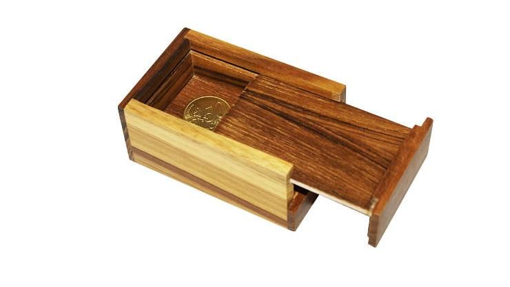 Le magicien emprunte une pièce (ou une bague, etc.). La pièce est signée et placée dans une belle boîte en bois, qui est conservée en sécurité par un spectateur. Le couvercle est fermé, et la boîte est secouée pour vérifier que la pièce se trouve toujours à l’intérieur. A tout moment durant votre routine, la boîte peut être secouée pour prouver que le spectateur détient toujours le précieux objet emprunté.