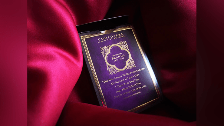Johannes Brahms Playing Cards, conçu par SixtyFourPlayingCards, est un jeu de cartes à jouer unique et élégant pour les collectionneurs, dont le protagoniste est l’un des plus grands compositeurs de musique classique et symphonique de tous les temps - Johannes Brahms. Le thème de Brahms est le violet foncé, et sera la couleur du thème de la boîte de rangement, le dos des cartes et le thème de la couleur des cartes de la Cour.
