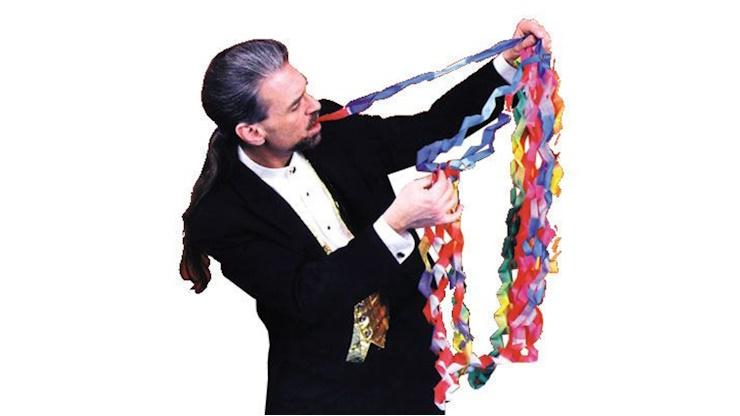 Une fois sorti de la bouche, le ruban s’ouvre en une guirlande multicolore et devient très, très volumineux, ce qui rend le tour encore plus spectaculaire.