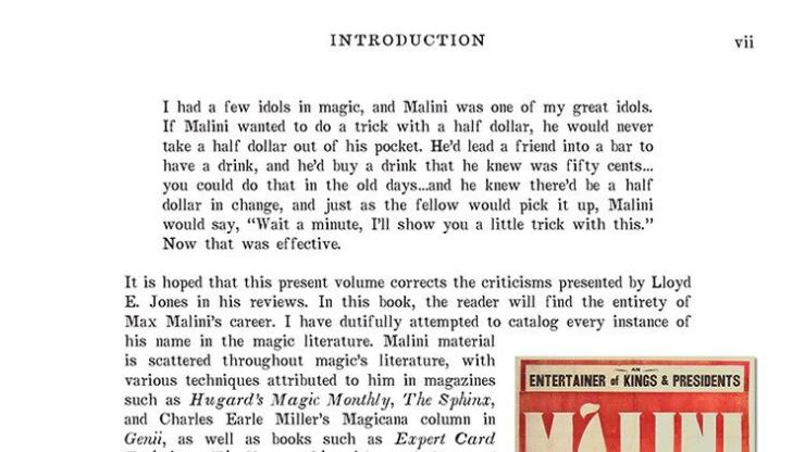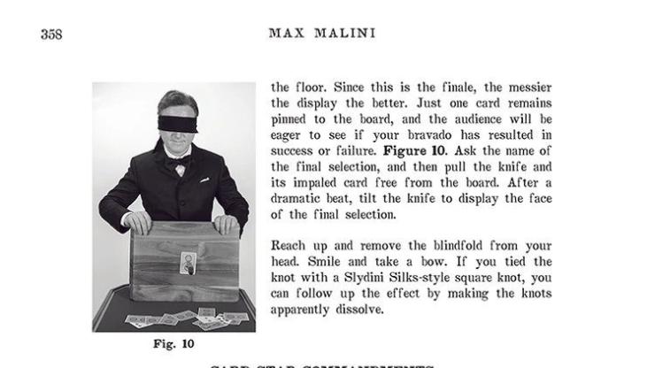Des méthodes derrière les célèbres tours de Malini Block of Ice Production et Blindfolded Card Stab aux techniques qu’il utilisait pour controler les cartes, forcer et palmer, en passant par une longue discussion sur le Malini Egg Bag et le tour Button Biting qui l’ont rendu célèbre, ce nouvel ouvrage est un véritable guide pratique.