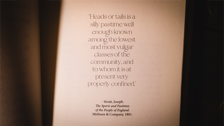 Le jeu de pile ou face contr?’lé lui-même - les principes fondamentaux et les détails de la technique. Trois variantes d’un rattrapage contr?’lé - permettant d’appeler la pièce en plein vol. Un tour de table contr?’lé. Une méthode astucieuse - permettant à quelqu’un d’autre de faire tourner la pièce sur la table. Trois exemples de performances, chacune se concentrant sur une application différente du lancer de pièce contr?’lé. Une liste d’autres applications diverses. Une exploration approfondie de l’histoire du mouvement.