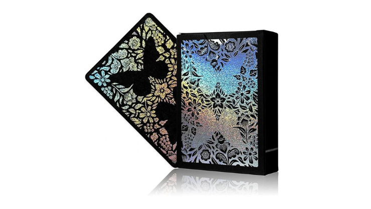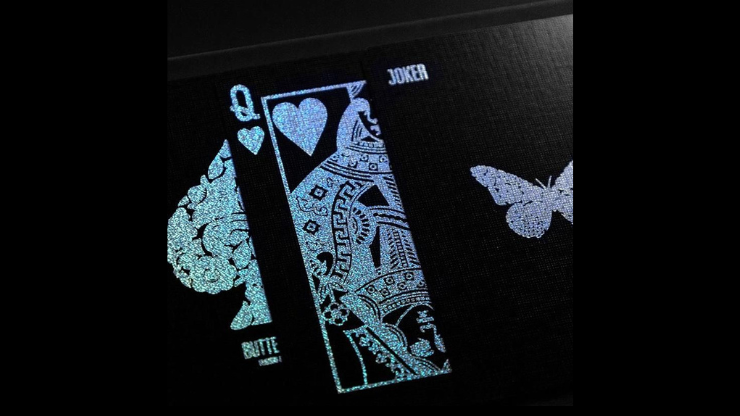 Jeu de cartes Butterfly édition Holo ! Ce jeu Butterfly unique présente un design noirci avec une bordure noire. Le dos et les faces ne comportent aucune couleur. Ils sont recouverts d’une feuille holographique !