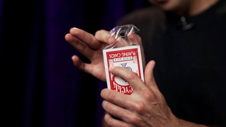 Vous prenez votre jeu de cartes et enlevez le cellophane à environ un tiers de la longueur du jeu. Un trou est clairement percé au milieu de la cellophane. Vous sortez alors votre marqueur et l’introduisez dans le trou tout en expliquant à votre public que ce qu’il voit est impossible. Vous retirez le marqueur du trou et le proposez à votre spectateur en lui demandant de le replacer. Lorsqu’il essaie de faire passer le marqueur à travers la cellophane, il s’aperçoit qu’il ne peut pas passer. C’est comme si une force invisible empêchait le marqueur de passer par le trou. C’est alors que vous soulevez la boîte de cartes pour la sortir de la cellophane et découvrir que l’air qu’elle contient s’est cristallisé en un bloc de verre solide. Remettez la cellophane sur le jeu de cartes et vous pourrez alors sortir un jeu de cartes complet de la boîte pour prouver que le verre ne s’y cachait pas et commencer à exécuter vos tours de cartes préférés.