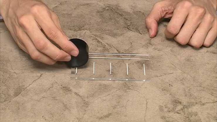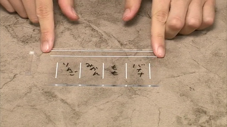 Le magicien montre un tableau transparent sur lequel sont inscrits quatre fruits différents. Un spectateur est invité à choisir l’un des fruits et à le cacher. Le tableau transparent est incliné pour former une rampe. Le magicien place un cylindre noir en haut de la rampe, et celui-ci roule lentement vers le bas. Cependant, le cylindre s’arrête mystérieusement lorsqu’il atteint le fruit choisi !
